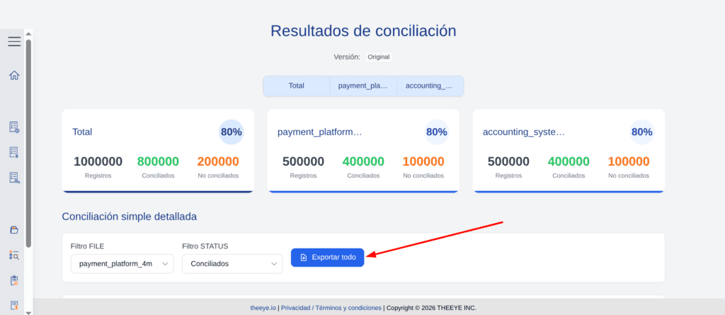 Para exportar los resultados puedes hacerlo desde la pantalla de resultados de conciliación mediante el botón “Exportar todo”.