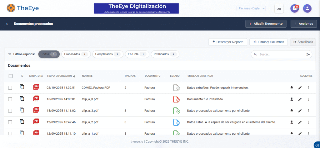 • Identificar documentos a corregir: Utilizar las columnas de estado y mensajes para identificar rápidamente los comprobantes que requieren una acción manual.