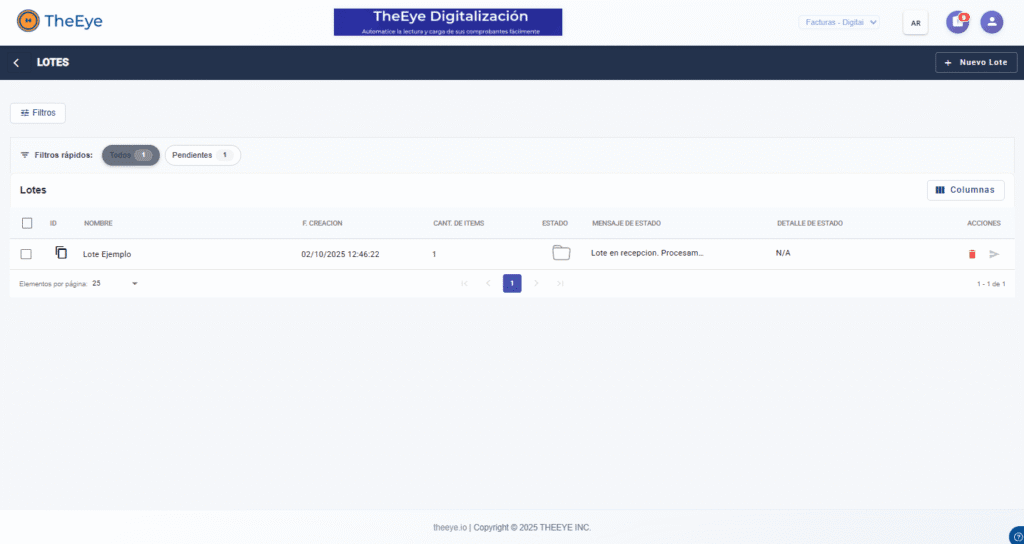 - Finalizar lote: Una vez enviado con éxito, el estado del lote cambia a “Finalizado” (verde) y se bloquea su edición.